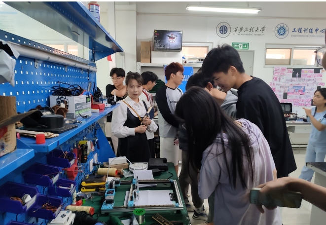 座谈会后,学院师生参观了工程训练中心的创客空间、木工坊、航模社、机器人实训基地和大学机械创新等实训室。