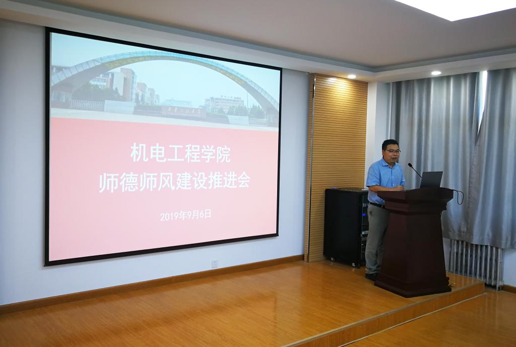 为贯彻落实校党委关于进一步加强教风学风建设专项行动的部署要求,在全国第35个教师节来临之际,2019年9月6日下午,开云kaiyun官网在临潼校区笃行楼学术报告厅举办以“弘扬高尚师德、潜心立德树人”为主题的师德师风建设推进会,校党委副书记赵小峰出席会议并讲话,机电学院全体教职工参加会议,机电学院党委书记王鸣媛主持会议。