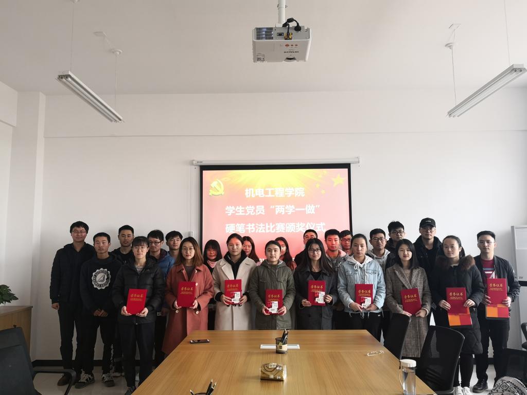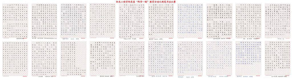 本次比赛是机电学院“党建+育人”系列活动之一,以深入推进“两学一做”学习教育常态化制度化为契机,旨在进一步加强学生党员的理想信念教育,牢固树立知党史、感党恩、跟党走的坚定信念,增强学生党员的荣誉感、责任感和使命感。党的十九大报告、《中国共产党章程》、社会主义核心价值观、《西安工程大学学生手册》、《西安工程大学校歌》等内容均在比赛抄写范围之内。本次活动共收到学生党员作品173篇,学院初选作品29篇,并邀请陕西省书法协会会员担任评审,最终评选出一等奖2篇、二等奖4篇、三等奖8篇、优秀奖15篇。