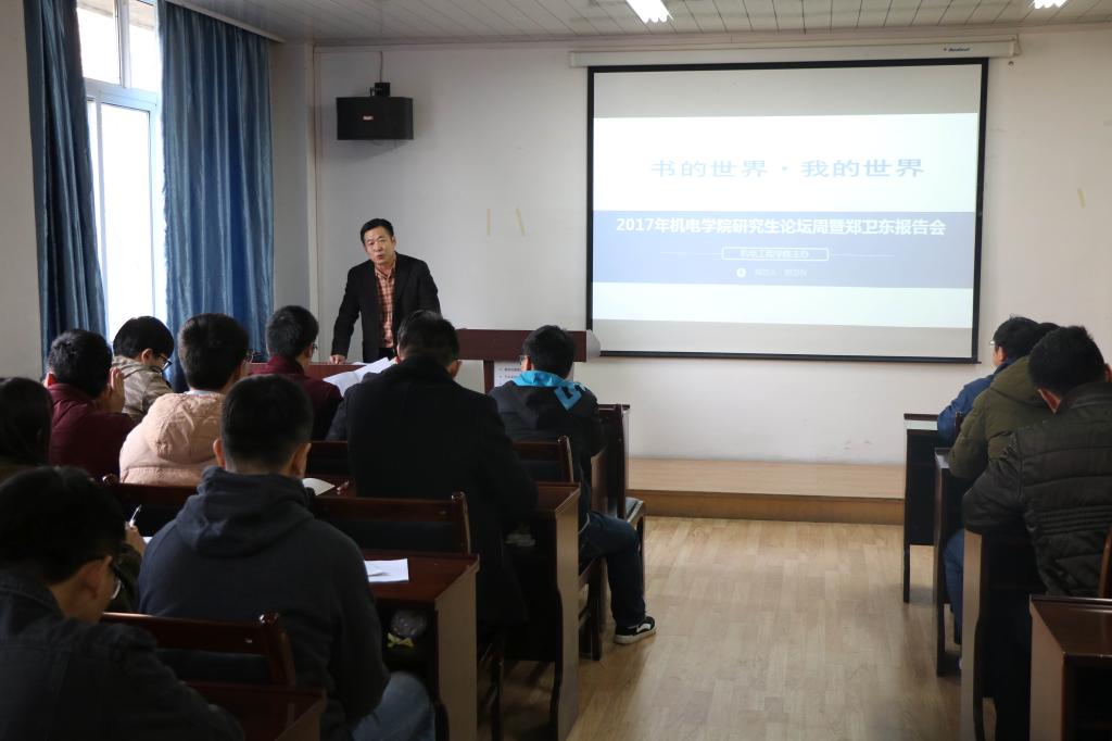 12月6日,机电学院举办研究生学术论坛活动周第三场报告会,本次报告会邀请开云官网教工读书协会会长郑卫东老师做了题为“书的世界,我的世界”的主题报告会。机电学院师生100余人参加了本次报告会,报告会由金守峰主持。