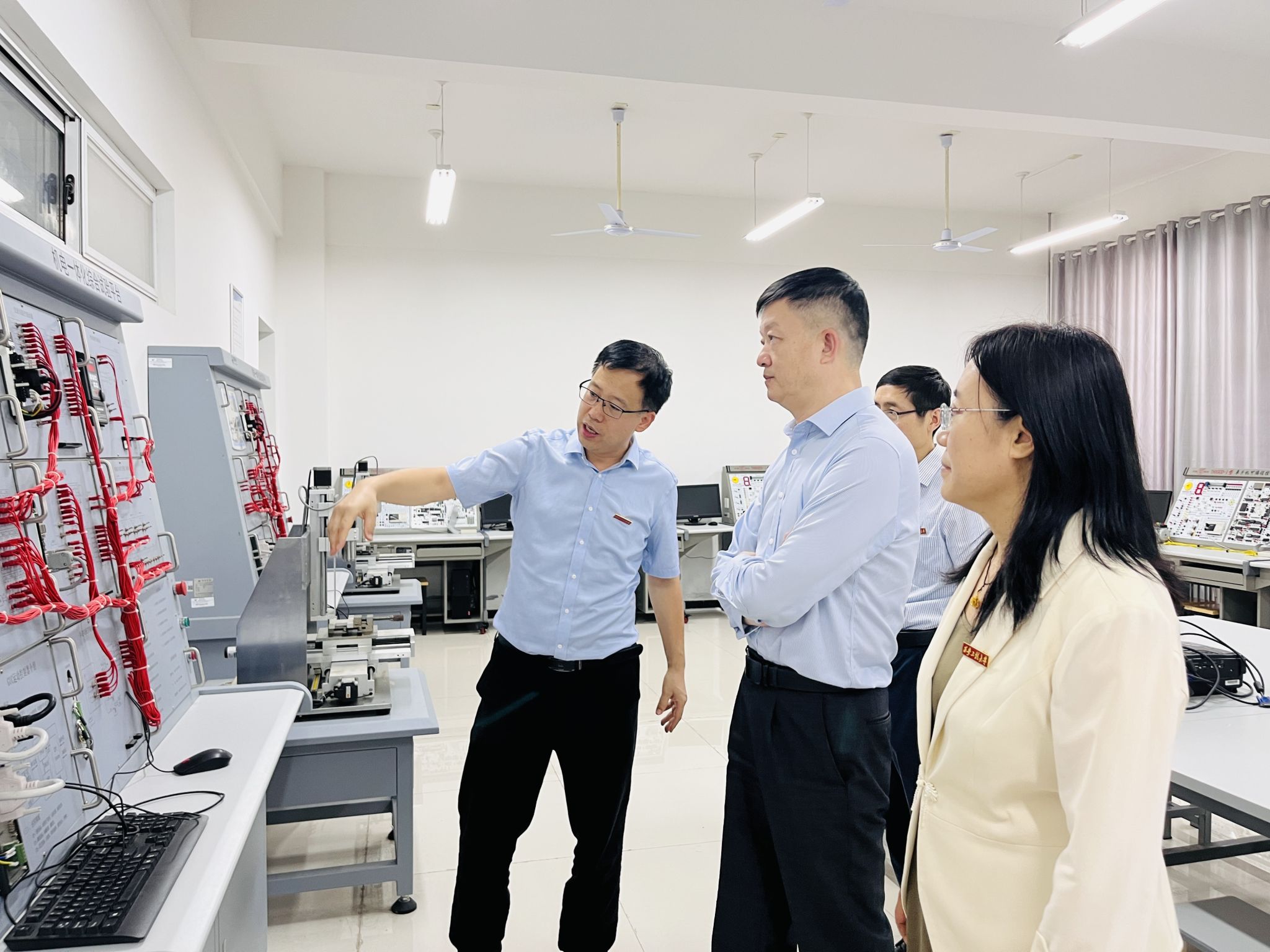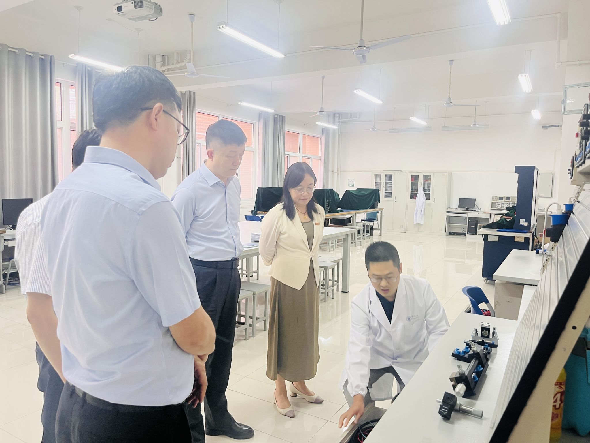 为顺利迎接学校本科教育教学审核评估工作,学院精心部署整体工作。陈革教授走访了机械设计基础实验室、测试技术实验室、机电综合实验室、慧鱼创新设计实验室等本科教学实验室,各实验室管理人员详细介绍了实验室的设施配备、运行管理、实践教学等情况。陈教授询问了学校对本科教学实验平台资金投入等相关问题。随后陈教授走访了智能化纺织装备与控制技术研究所,所长张团善教授介绍了无三角智能电脑横机和全成型智能一体袜机及目前项目的研究现状,陈教授对全成型智能一体袜机相关技术非常感兴趣,希望研究团队加快研究速度和专利申请,争取早日在国际新型织袜机领域有所突破。