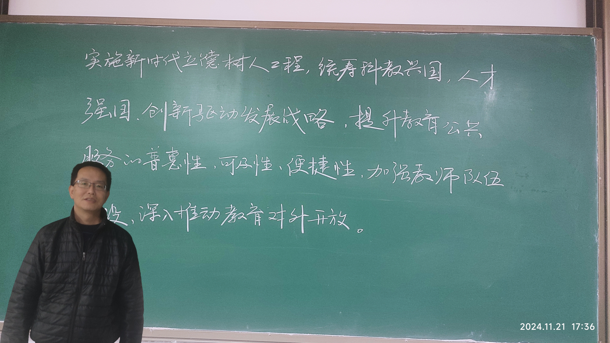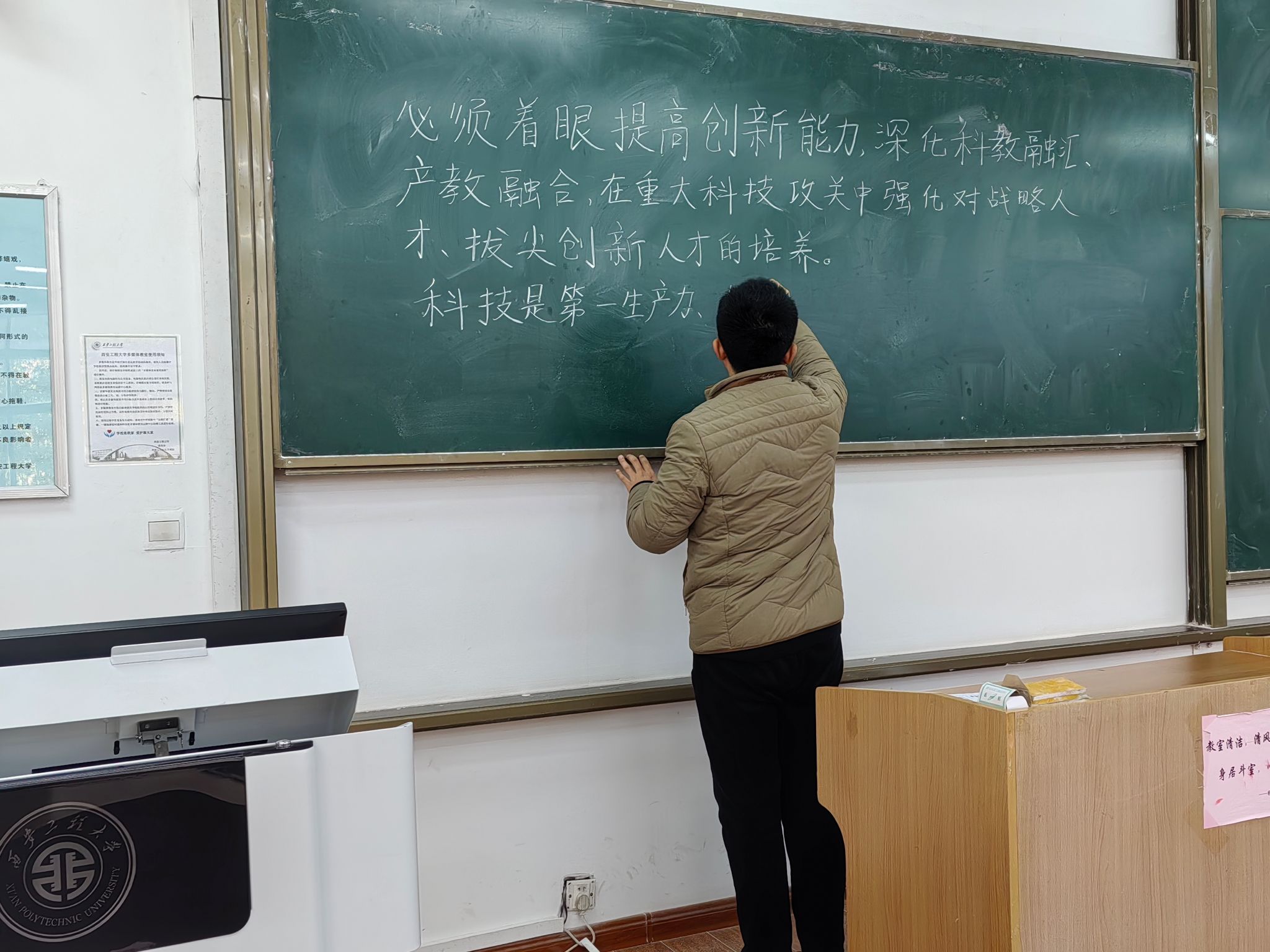 开云kaiyun官网已经连续举办六届教职工粉笔板书比赛。本次活动受到学院教职工的热烈响应,纷纷利用课余时间深入学习习近平总书记系列讲话、党的二十大精神和党的二十届三中全会精神等内容,在教室或教研室勤练粉笔板书,对理论水平和教学能力的提升起到了积极的促进作用。(撰稿:李良 审核:阚佩)