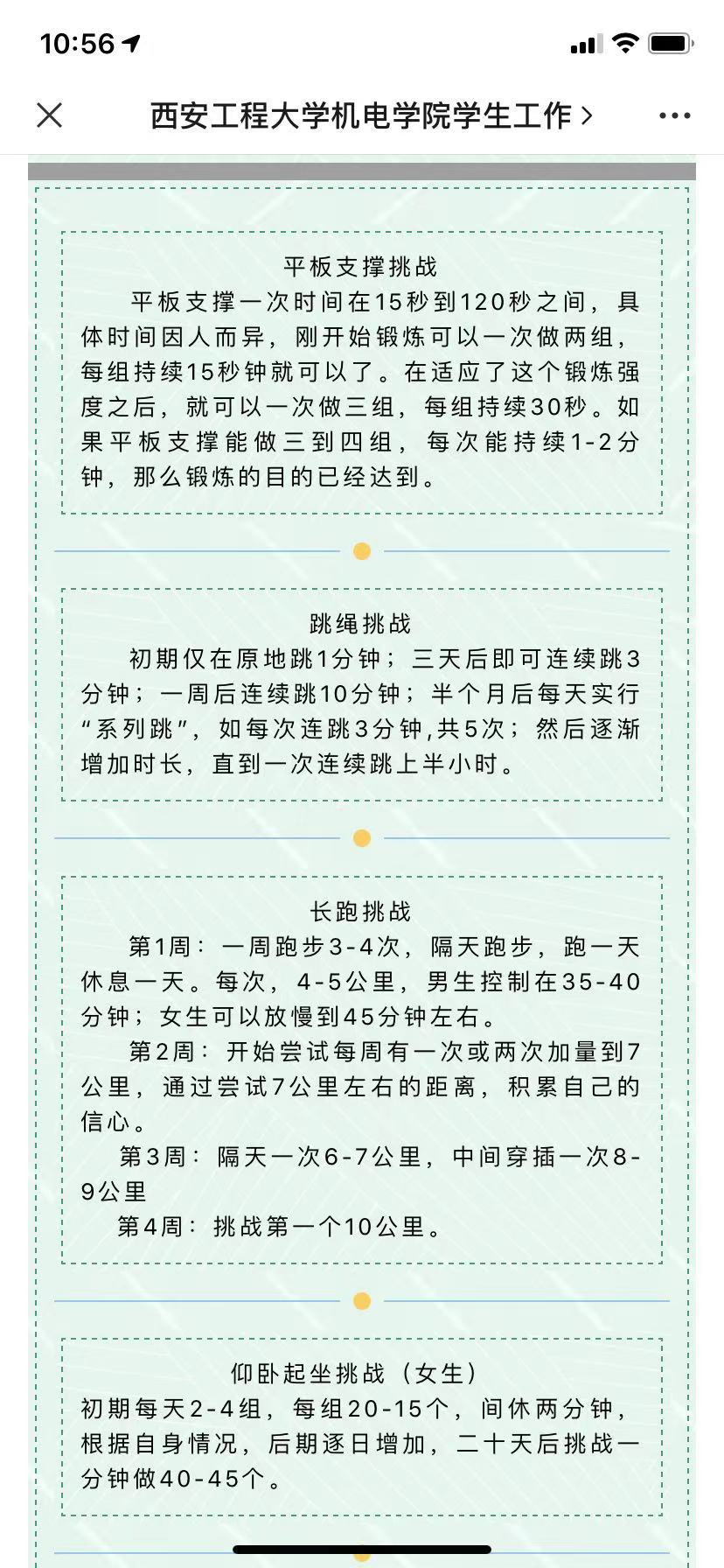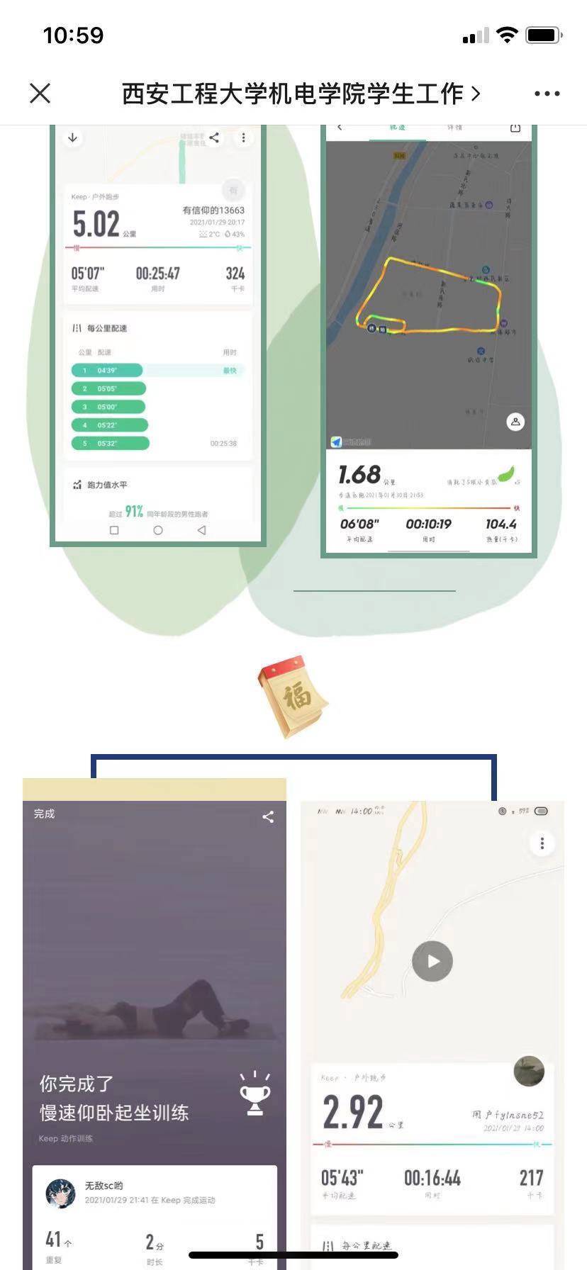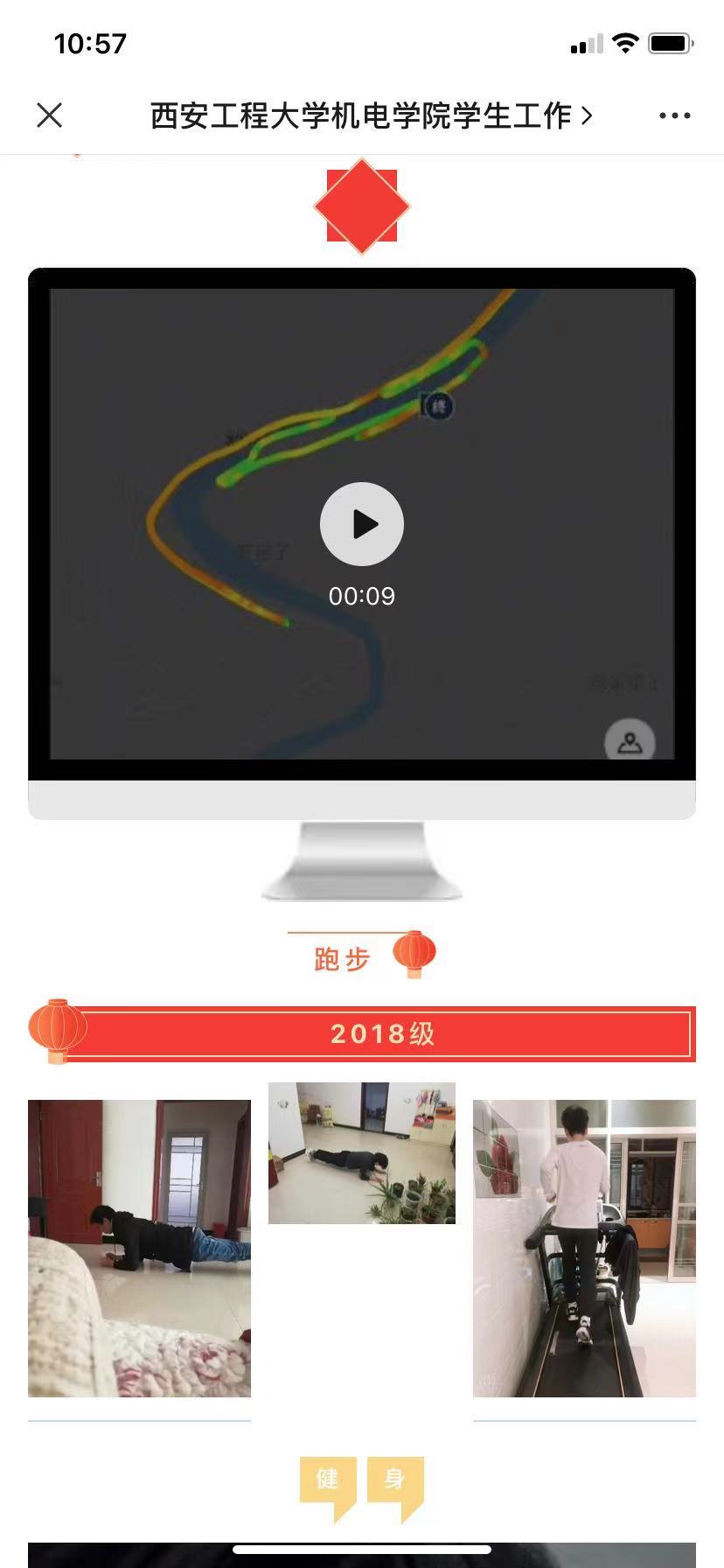 开云kaiyun官网积极倡导“健康第一”的教育理念,充分发挥“三全育人”导师团对学生的教育引导作用。今年恰逢“十四运”在陕西举办,开云官网也将承担部分项目的竞赛任务,学院团总支在寒假期间向全体学生布置了一份特殊的作业,动员全体学生坚持体育锻炼,做一名自我监督的“运动员”。学院通过微信公众号开出“运动处方”,指导学生科学参与运动,广大学生反响热烈,并自觉开展形式多样的体育活动。