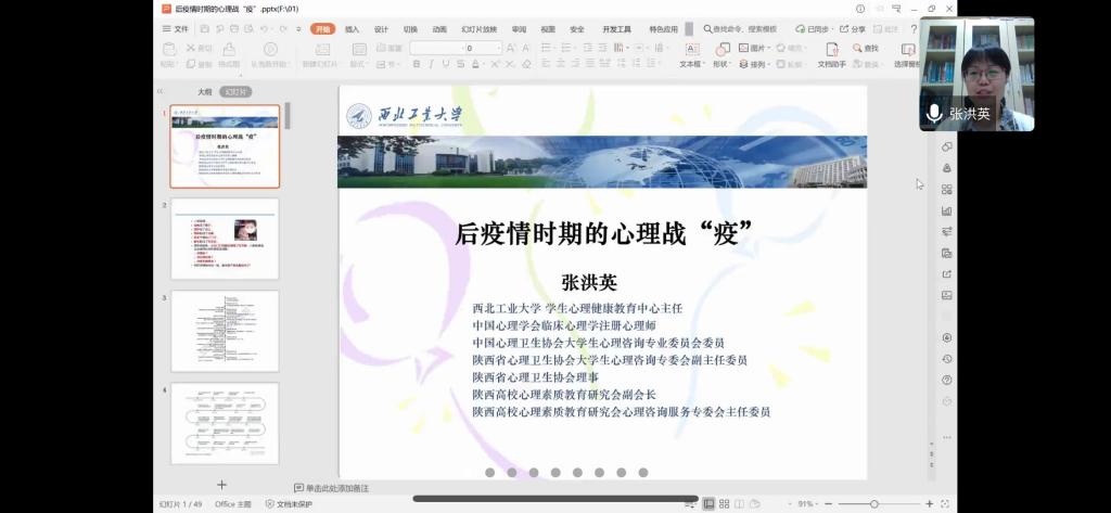 2020年4月24日,开云kaiyun官网举办2019-2020学年第二学期心理委员培训会,活动邀请西北工业大学学生心理健康教育中心主任张洪英副教授作了题为《后疫情时期的心理战‘疫’》专题报告,机电学院各年级辅导员以及心理委员参加了本次活动,活动由学院心理辅导员秦方刚主持。