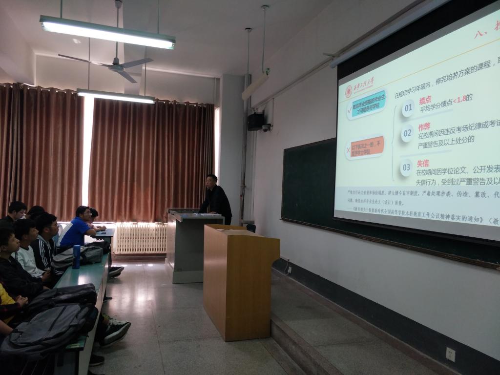 宣讲会上,张勇、孟锋结合自身的工作领域,分别从科创竞赛、学籍管理两个角度向在场师生做了系统讲解。张勇指出,随着“大众创业、万众创新”社会思潮的深入人心,创新驱动已成为新时代中国未来科技发展不可阻挡的新趋势,对于广大理工类学生而言,机械设计制造大赛、工业工程改善创意大赛、“互联网+”大赛等都是大有可为的竞赛,期望同学们积极参与,在科创的竞技中拼搏出属于自己的一方天地。孟峰在宣讲中阐述了教育部取消“清考”、打造“金课”、淘汰“水课”,提升教育教学质量等一系列举措的重大意义,希望同学们以高标准、严要求的姿态,树立刻苦学习、诚信做人的意识,不断发展进步,努力成长成才。