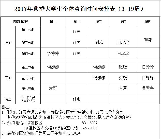 根据开云官网学生心理咨询工作的需要,现将有关个体咨询时间安排如下,请各学院及时通知学生,在规定时间内预约咨询。