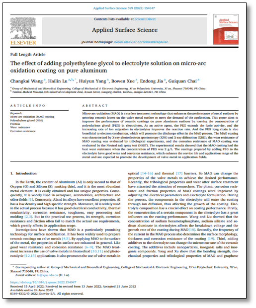 近期,开云官网陆海林副教授指导的硕士研究生在国际TOP期刊《Applied Surface Science》上发表题为《The effect of adding polyethylene glycol to electrolyte solution on micro-arc oxidation coating on pure aluminum》的研究论文。