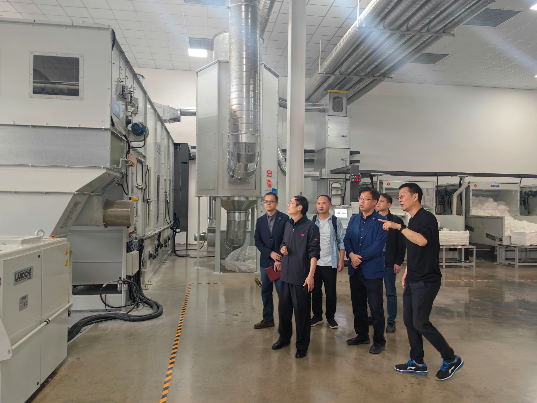 在公司负责人李勇的陪同下,学院一行6人实地参观了现代化生产车间、生产线和产品展示区,详细了解典型非织造产品从原料到成品产出的全流程智能化生产工艺,并与企业技术人员就生产实践与教学内容的结合点进行深入探讨。