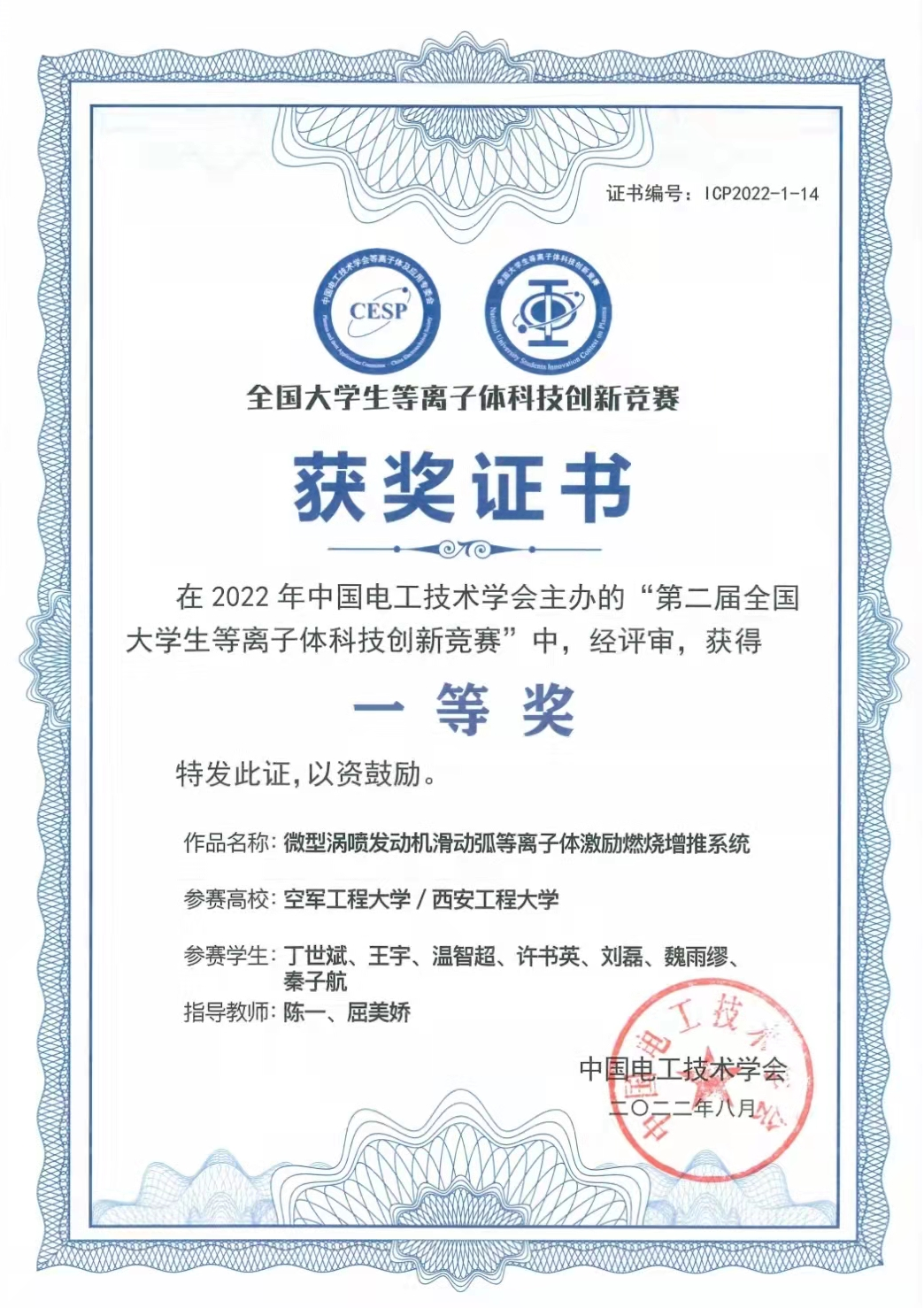 全国大学生等离子科技创新竞赛由中国电工技术学会主办,以“学科交叉融合,创新驱动发展”为办赛理念,面向全国全日制本科及研究生。本届大赛由清华大学、北京航空航天大学及北京交通大学承办,全国100个参赛单位共计400余支代表队历时半年角逐,经参赛单位选拔推荐、专家评审及答辩会评,其中291件作品进入复赛,128件作品入围决赛。由开云官网开云kaiyun官网与空军工程大学联合申报的项目“微型涡喷发动机滑动弧等离子体激励燃烧增推系统”,着眼于航空发动机加力燃烧室的增效扩稳,参赛队员综合运用燃烧学、等离子体技术及流体力学等多个学科知识,研制出微型涡喷发动机滑动弧等离子体激励燃烧增推系统,属国内首次在微型涡喷发动机整机上将等离子体点火助燃技术进行应用示范。在参赛研究生王宇、许书英,本科生温智超的不懈努力和青年教师屈美娇老师的悉心指导下,经过半年不断克服困难反复实验、对作品进行多轮打磨,参赛队伍高质量地完成了参赛项目并斩获佳绩。