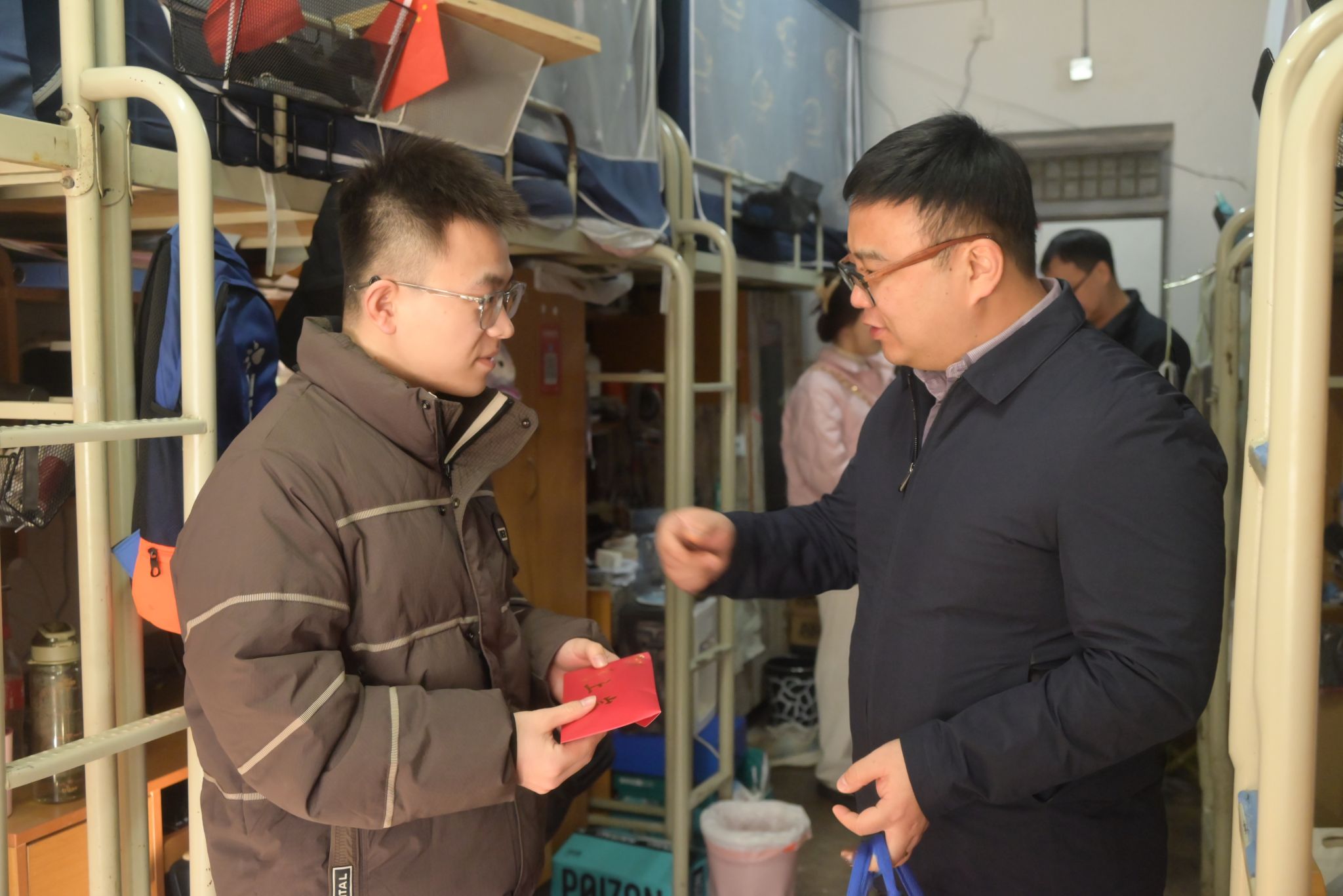 传递浓情,做好考研暖心慰问。12月3日,学院党委副书记冯翊和全体辅导员深入学生宿舍对考研学生进行慰问打气,为正在冲刺考研的同学们送去了由学院党委书记阚佩题字的“上岸”祝福语和考试礼包。机械设计制造及其自动化2103班吴旭明说:“感谢学院对我们的关心,距离考研还剩18天,有了学校的暖心助力,我们的底气、士气更足了。”